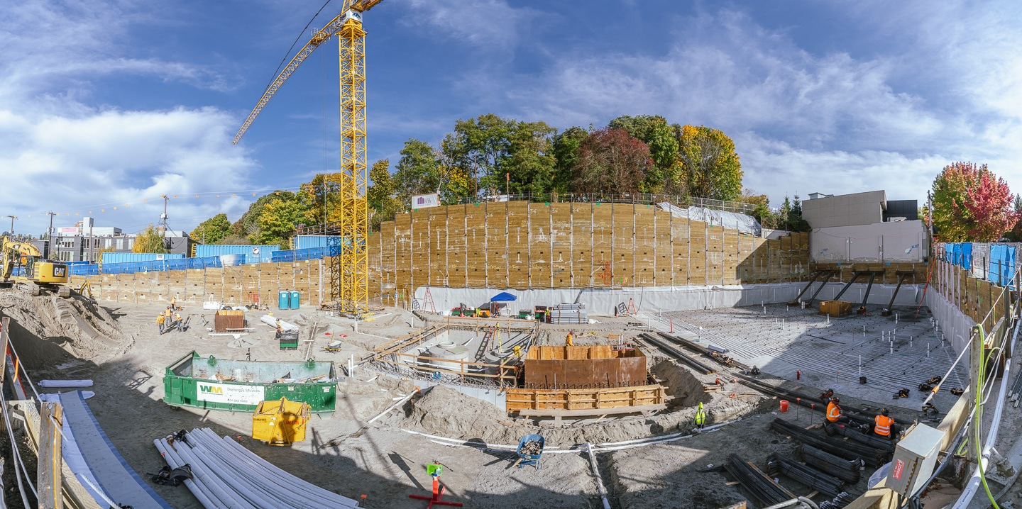 Installation of vertical below-grade waterproofing during an extremely wet seasonal period combined with less than ideal site conditions.